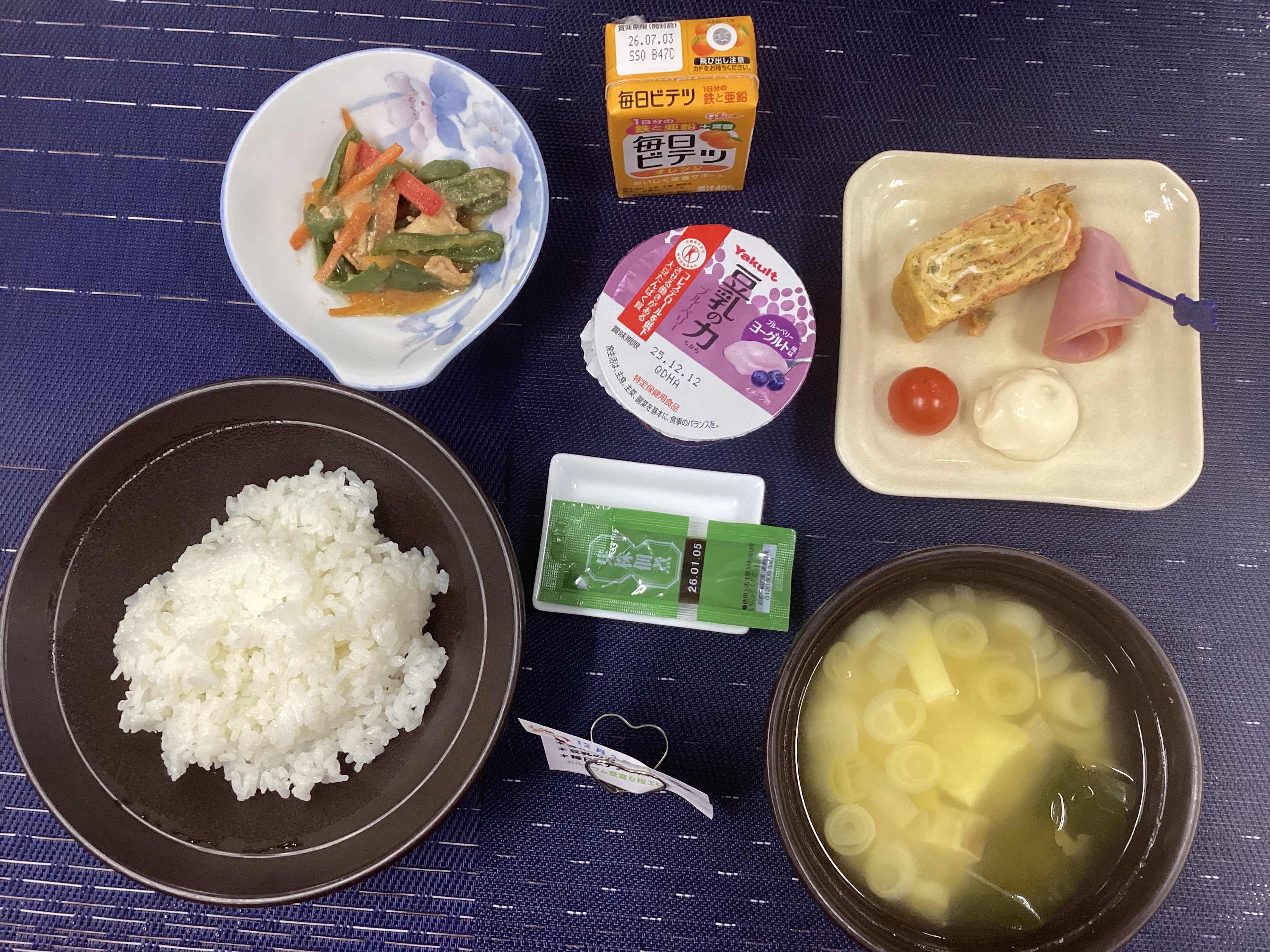 ご飯、 焼きネギの味噌汁、 桜エビ入り玉子焼き ピーマンの味噌炒め、 めかぶ佃煮 豆乳の力 毎日ビテツ