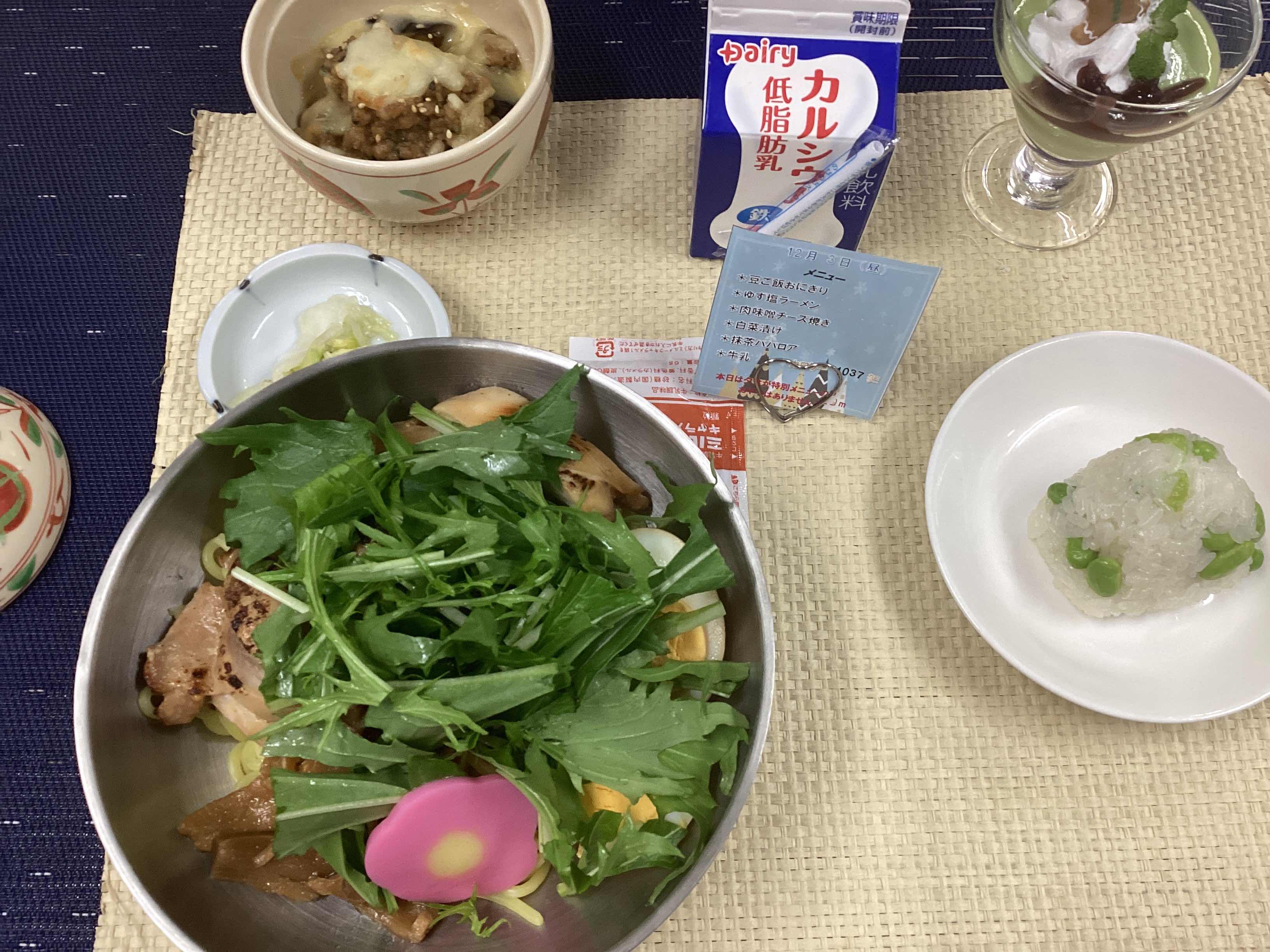 豆ご飯おにぎり ゆず塩ラーメン 肉味噌チーズ焼き 白菜漬け 抹茶ババロア 牛乳