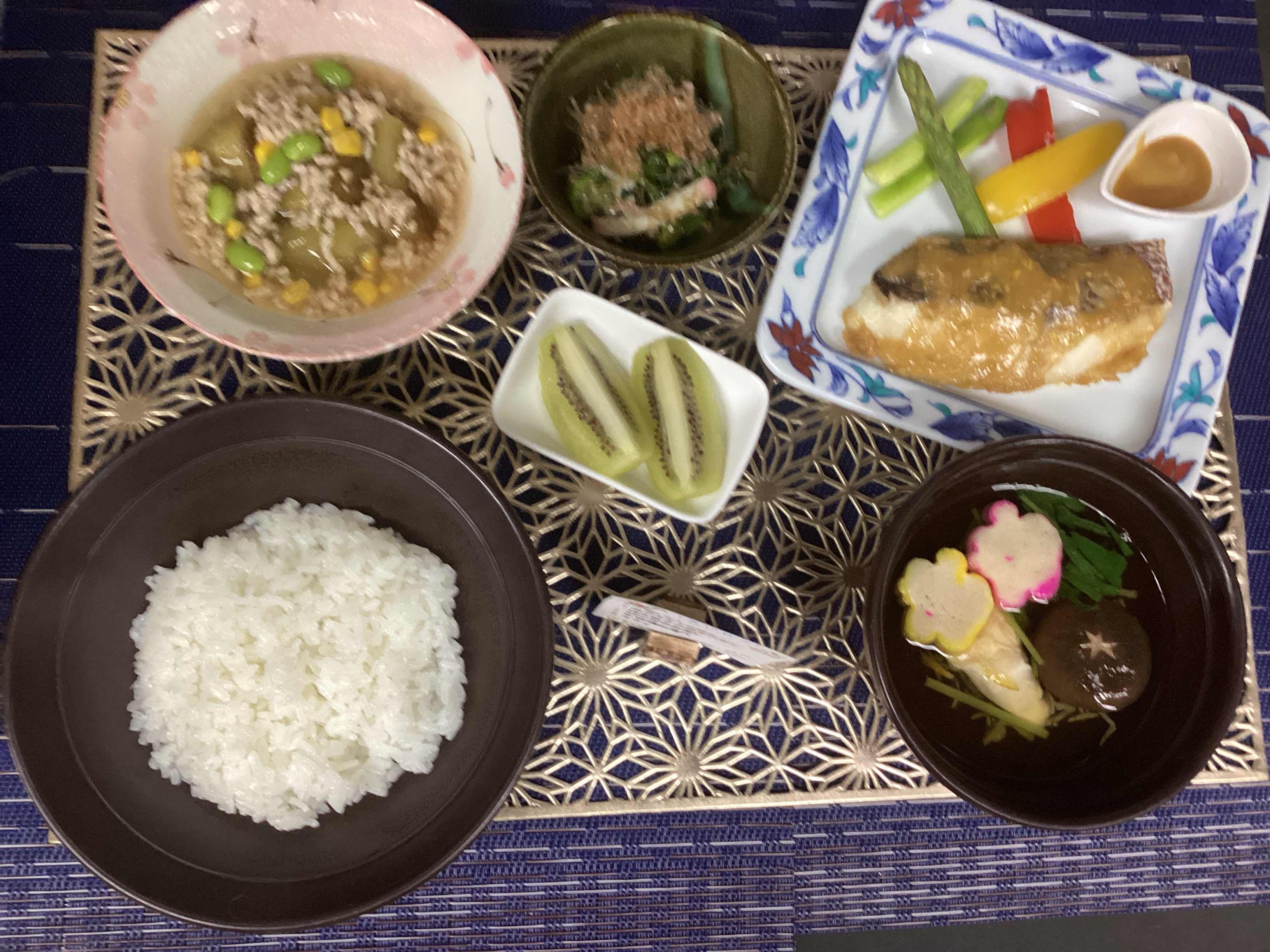 ご飯 キャベツの味噌汁 鶏の照り焼き 小松菜と揚げの炒め きゅ…