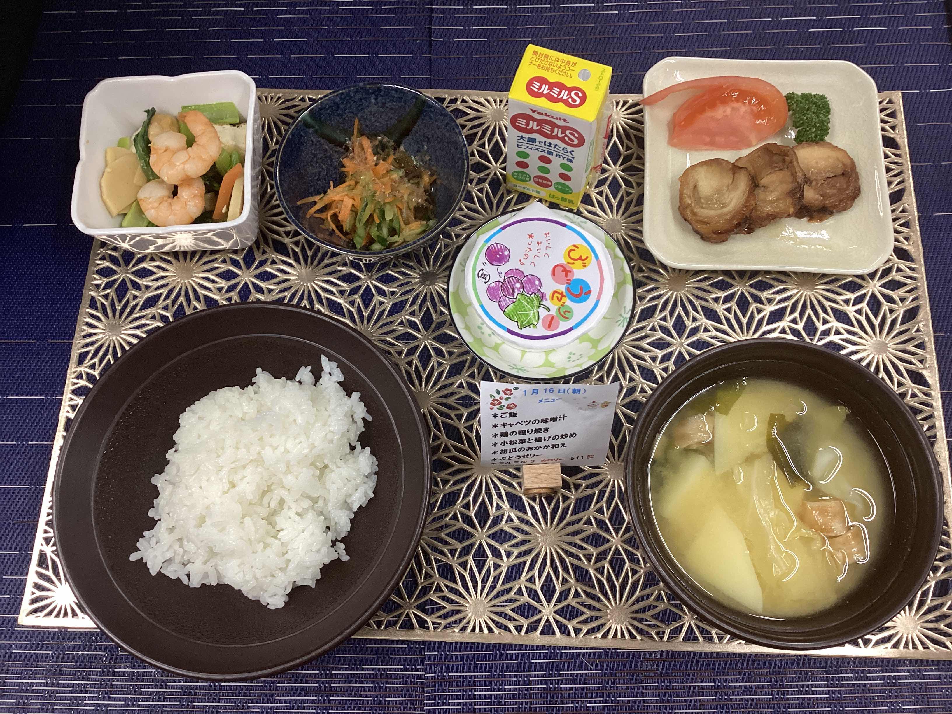 ご飯 キャベツの味噌汁 鶏の照り焼き 小松菜と揚げの炒め きゅうりのおかか和え ぶどうゼリー ミルミルS