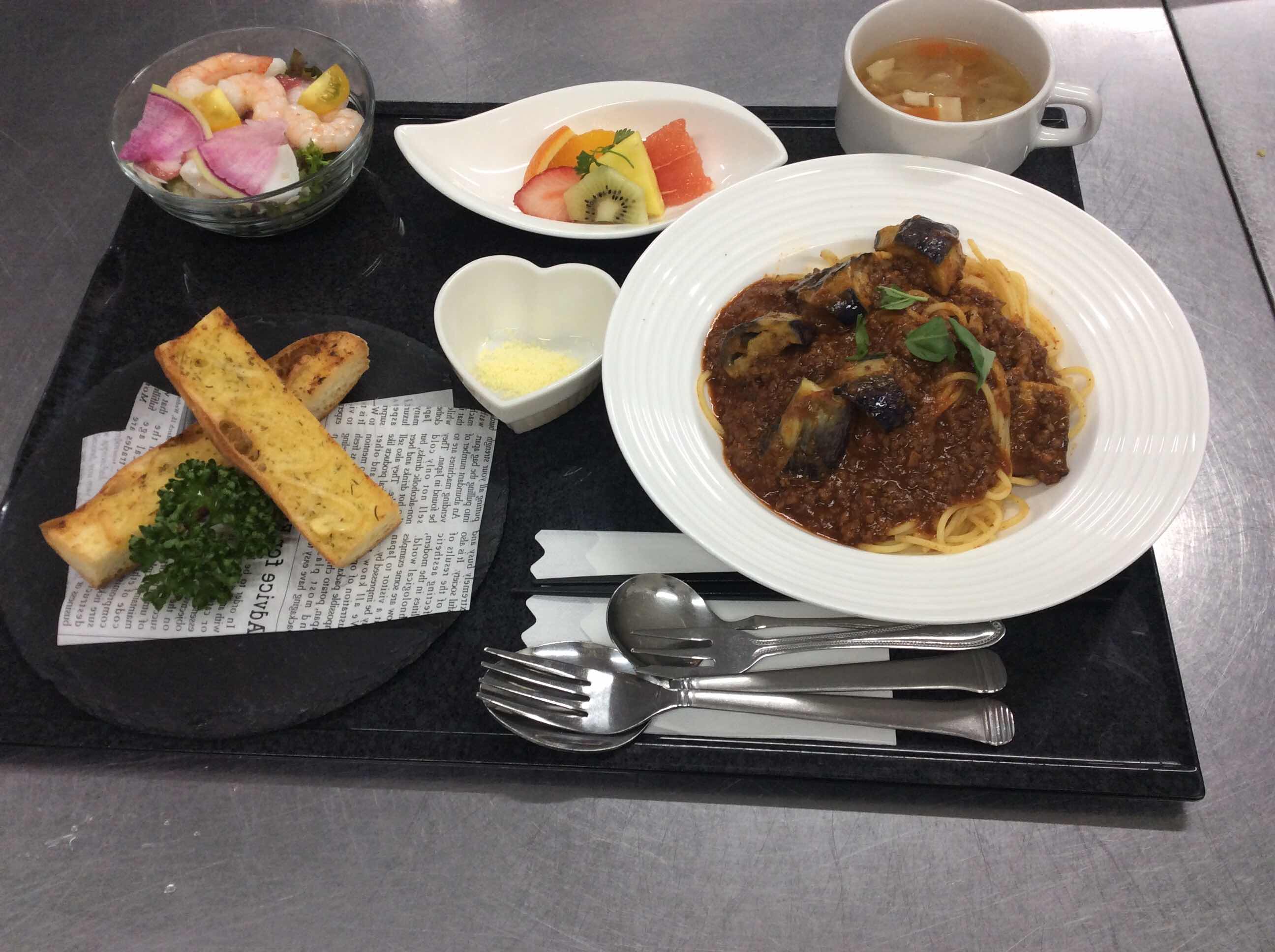 茄子のミートソーススパゲッティ、ガーリックトースト、海の幸マリネサラダ、具沢山スープ、フルーツバリエ