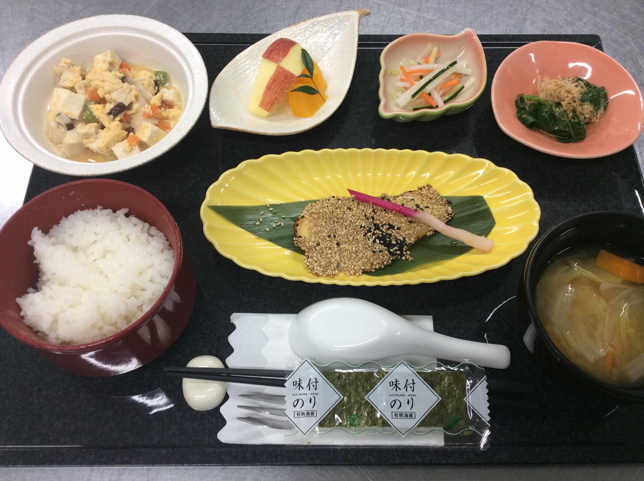鮮魚の利久焼き、炒り豆腐、三色なま酢、法蓮草おかか和え、味噌汁、御飯、果物