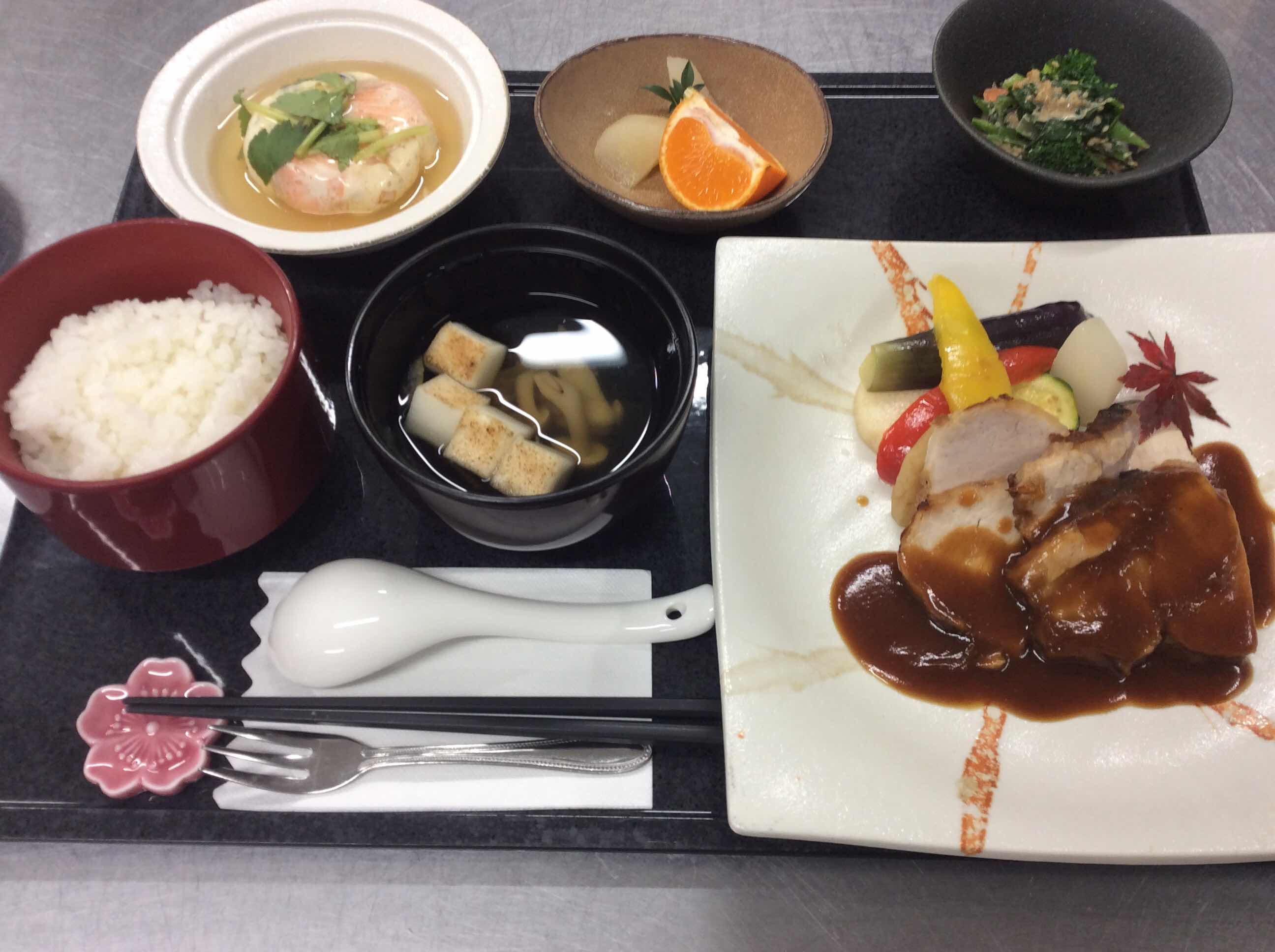 和風ローストポーク サーモンの巻繊蒸し 青菜とインゲンの胡麻和え 吸物 御飯 果物