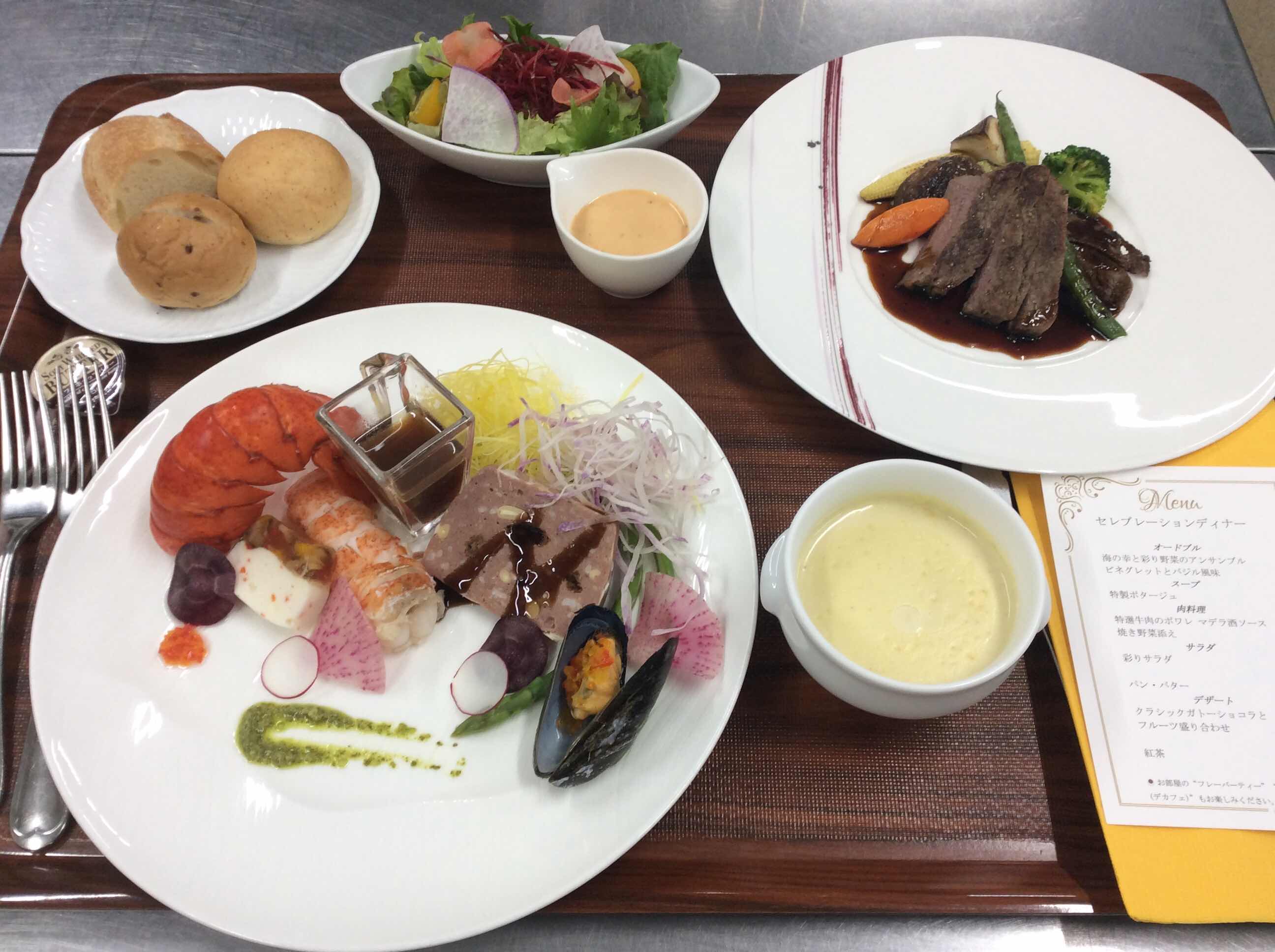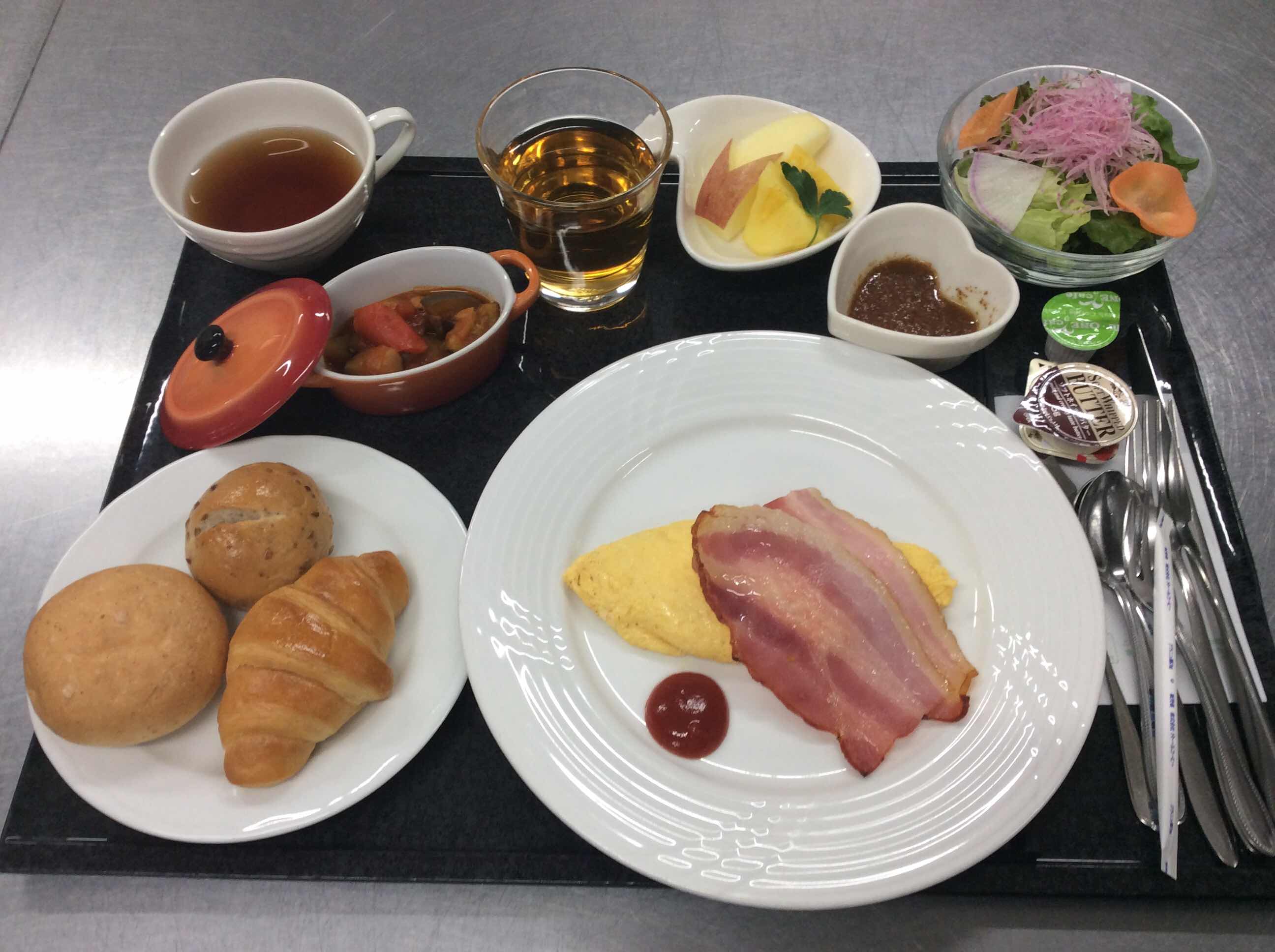 パン3種、オムレツ、ベーコンソテー、ラタトゥイユ、季節のサラダ、フルーツ、ジュース、紅茶