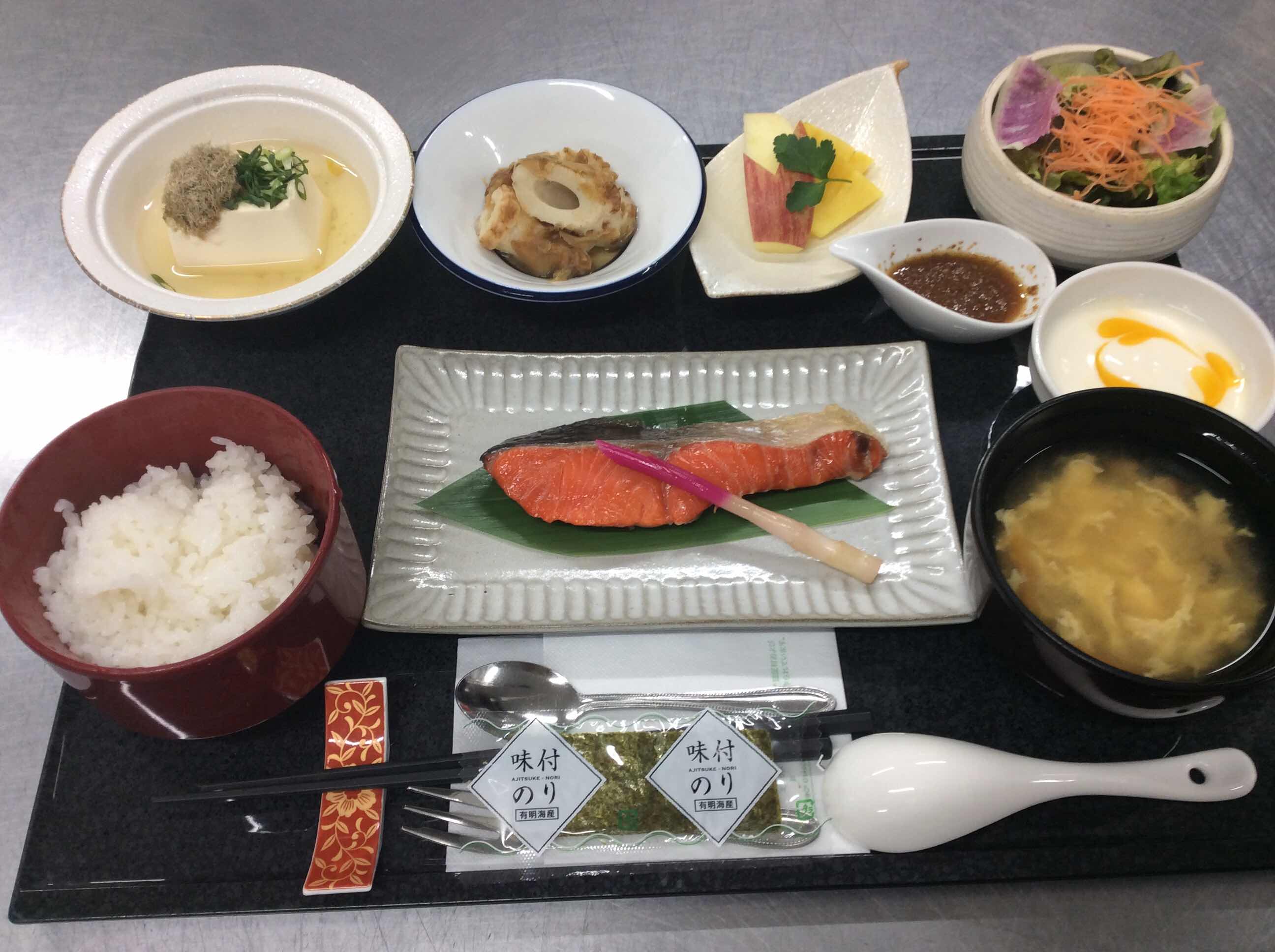 鮭の塩焼き、竹輪の土佐煮、煮奴、サラダ、味噌汁、御飯、味付け海苔、果物、ヨーグルト