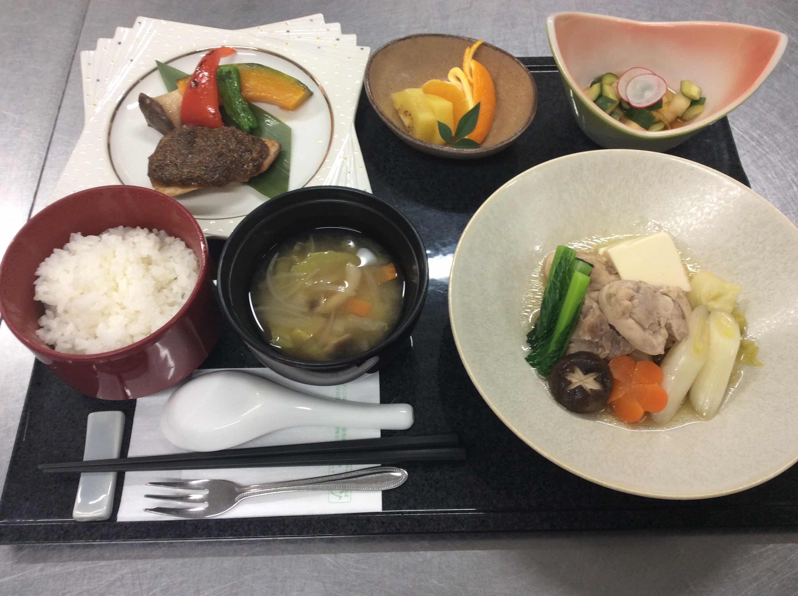 若鶏の旨煮、鰤の磯焼き、大根と胡瓜のポン酢浸し、味噌汁、御飯、果物