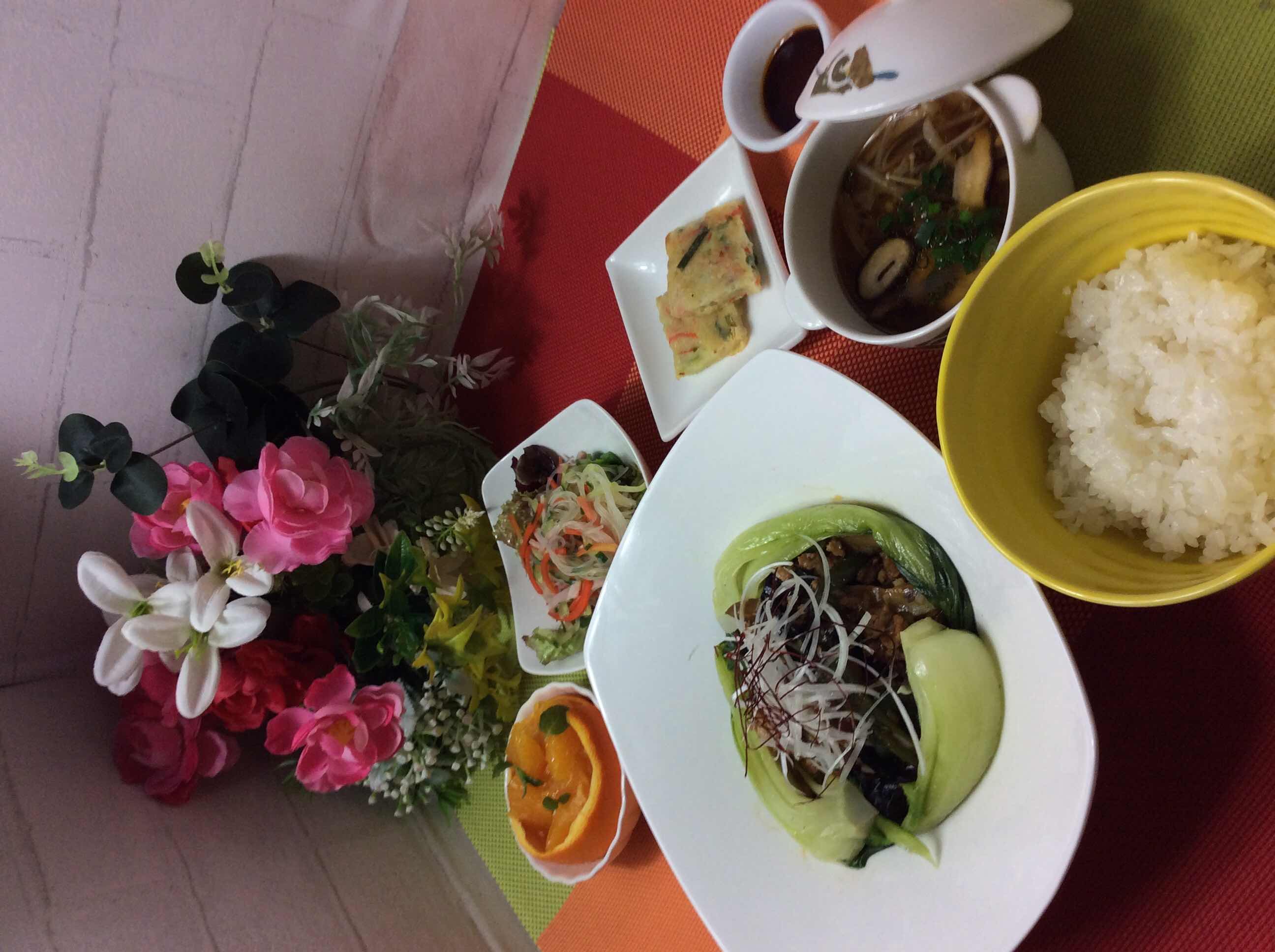 本日の夕御飯は、麻婆茄子、チヂミ、春雨サラダ、御飯、きの子と野菜の中華スープ、果物です。