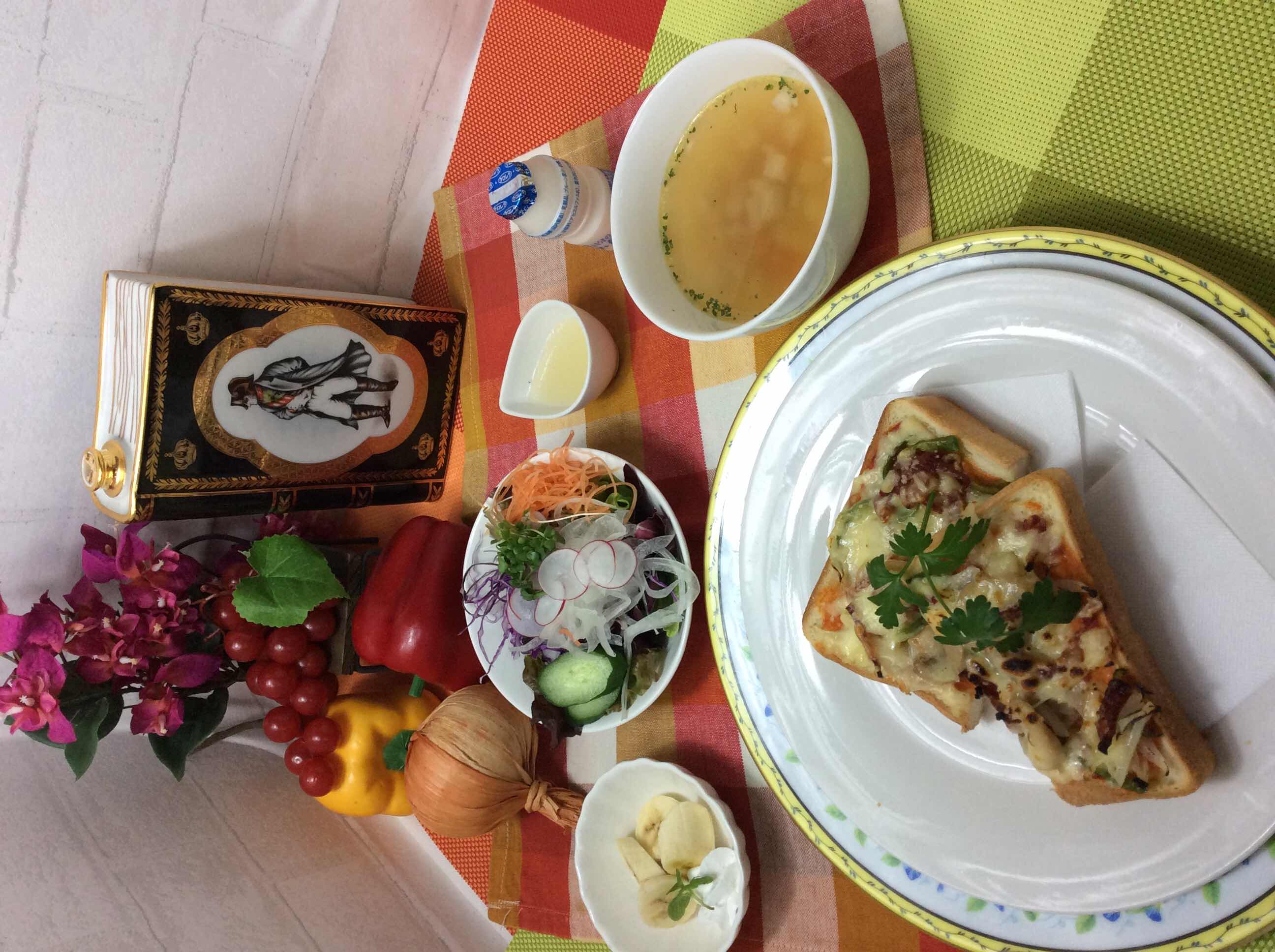 おはようございます。 本日の朝食のメニューは、ピザトースト、コンソメスープ、サラダ、鉄分ジュース、フルーツです。