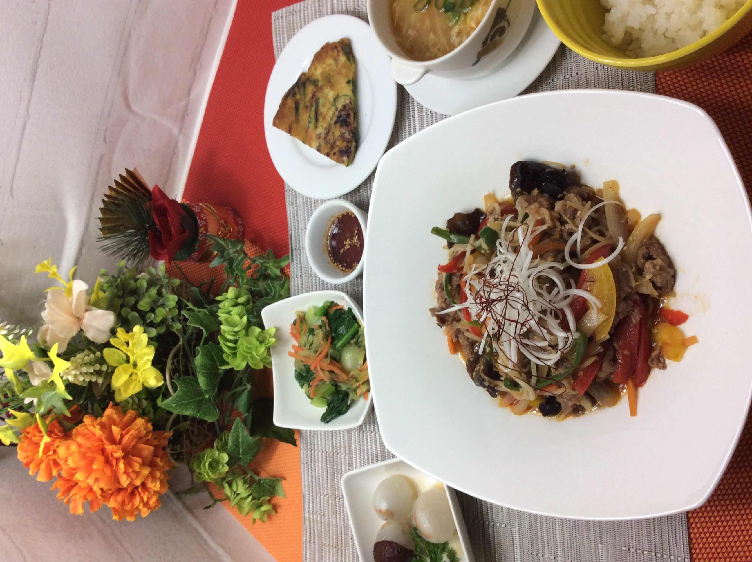 本日の夕御飯は、プルコギ、チジミ、青梗菜のナムル、御飯、玉…