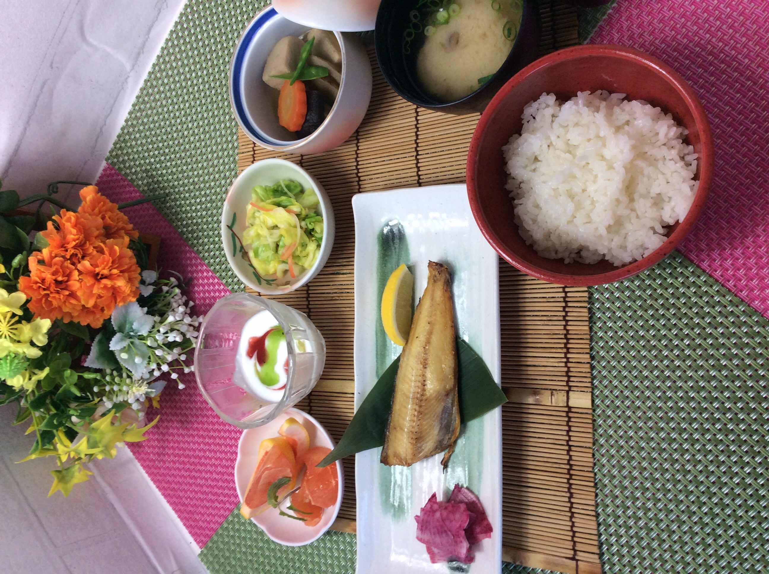 おはようございます。今朝の献立、ホッケ塩焼き、高野豆腐と野…