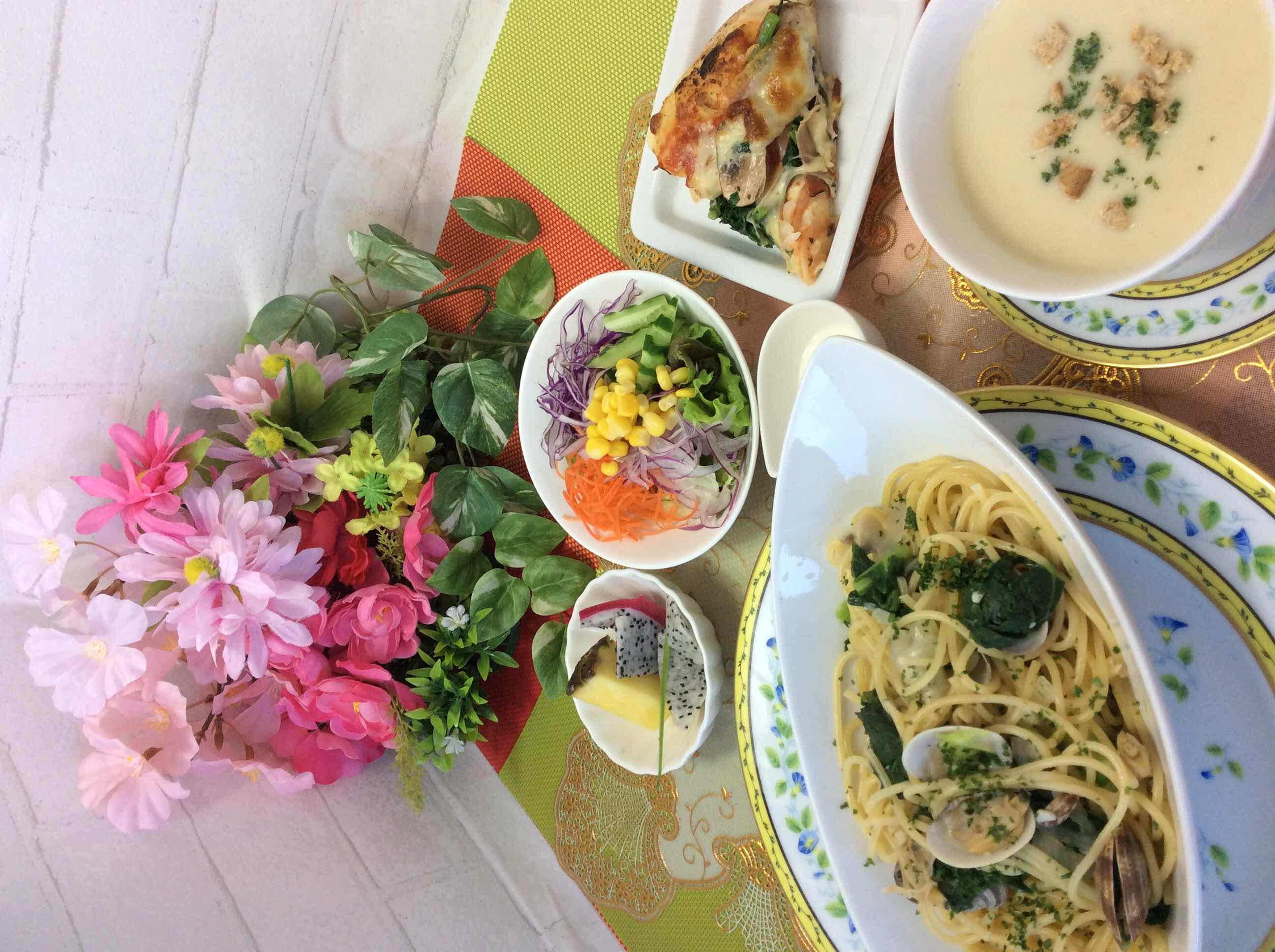 本日のランチは、かき菜のボンゴレビアンコパスタ、じゃがいもと白いんげん豆のスープ、春菊とマッシュルームのピッツァ、 サラダ、フルーツです。